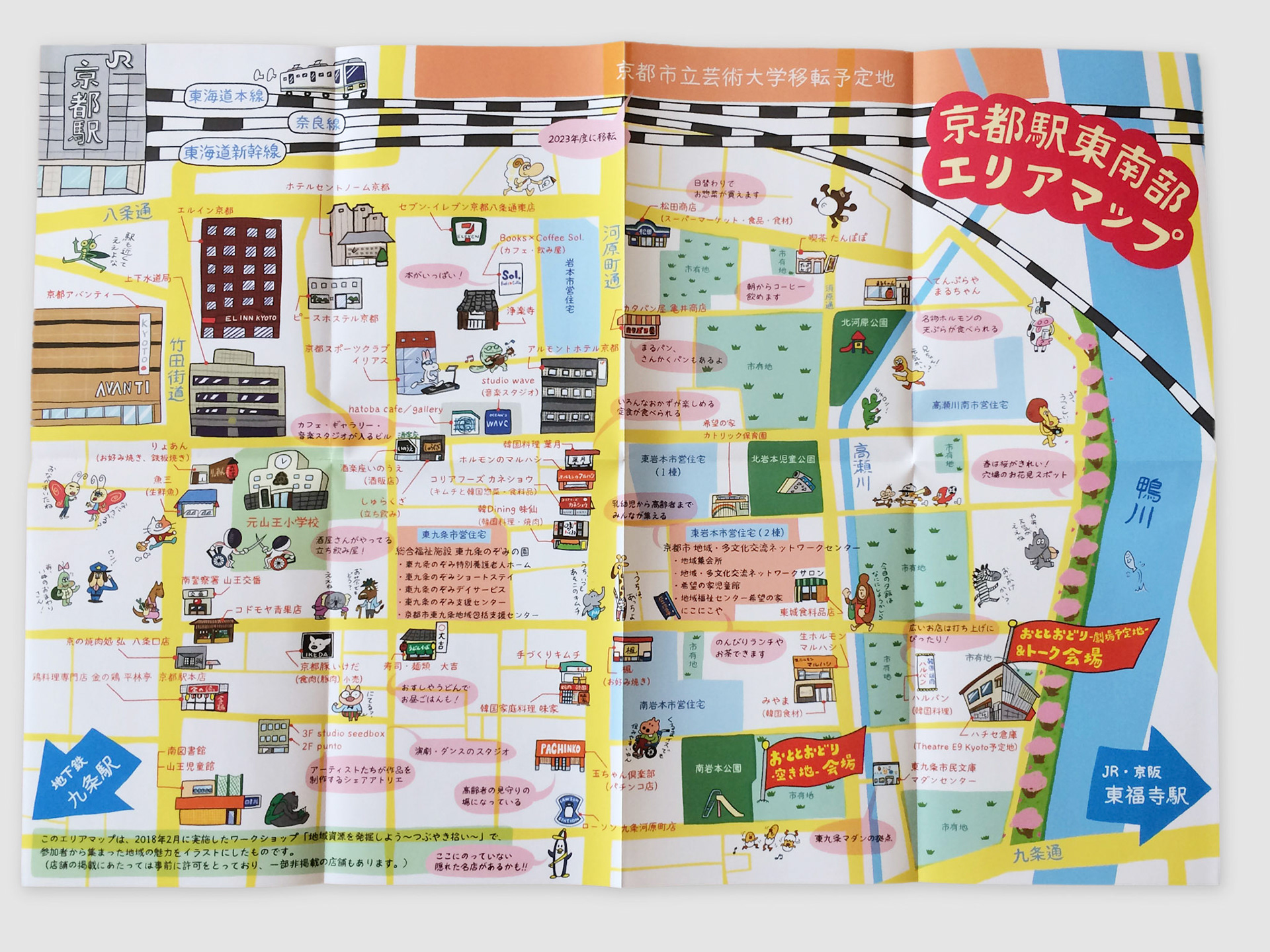 京都駅の東南部に位置する京都駅東南部エリアにて行われたイベント「おととことのまつりごと」で使用されたマップのイラスト、デザインの制作をいたしました。「京都駅東南部エリアマップ」はイベント終了後も京都駅東南部エリアの施設で配布されております。